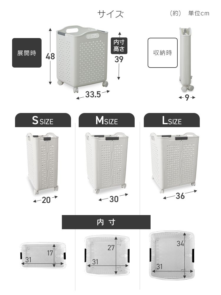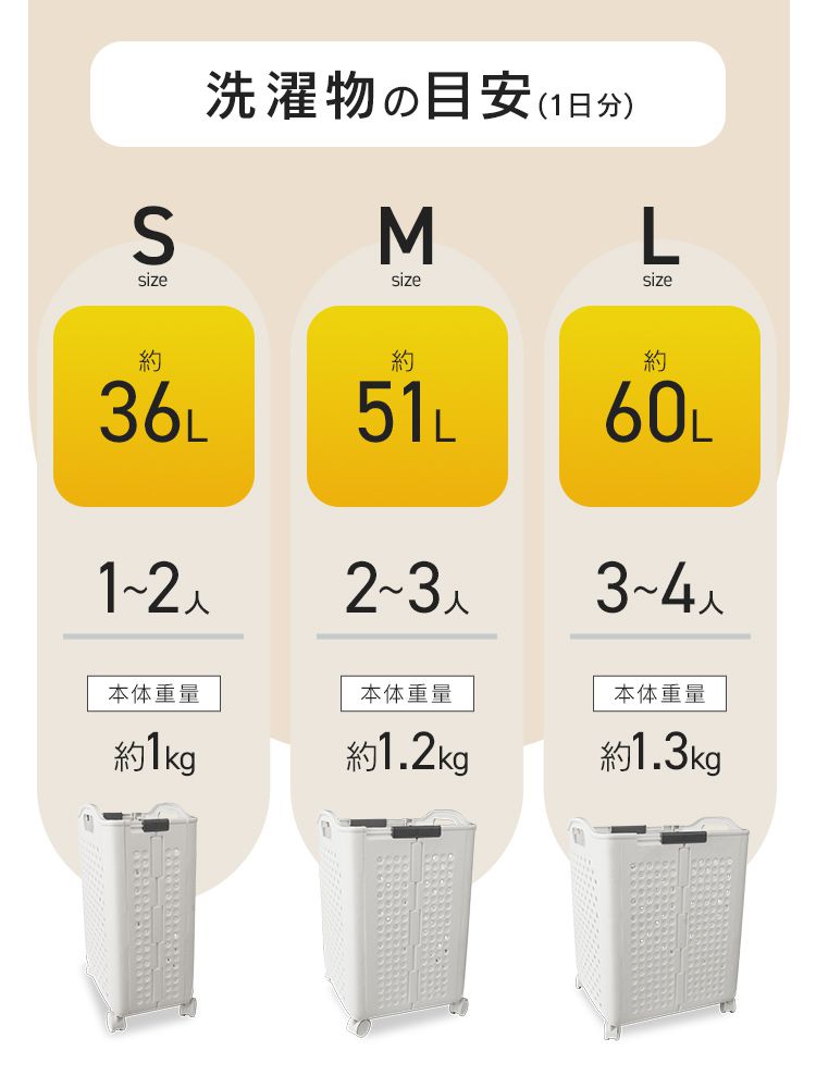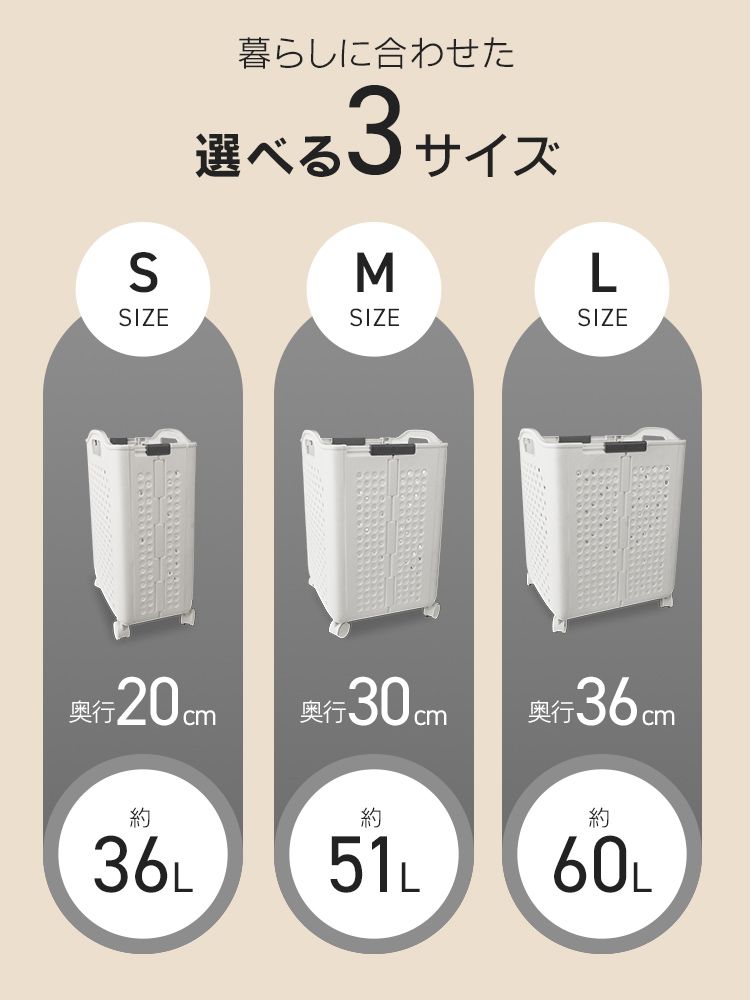 S・M・Lの3サイズ展開で、一人暮らしからファミリーまで、タオルや衣類、バスタオル、シーツなどをまとめて収納可能です。