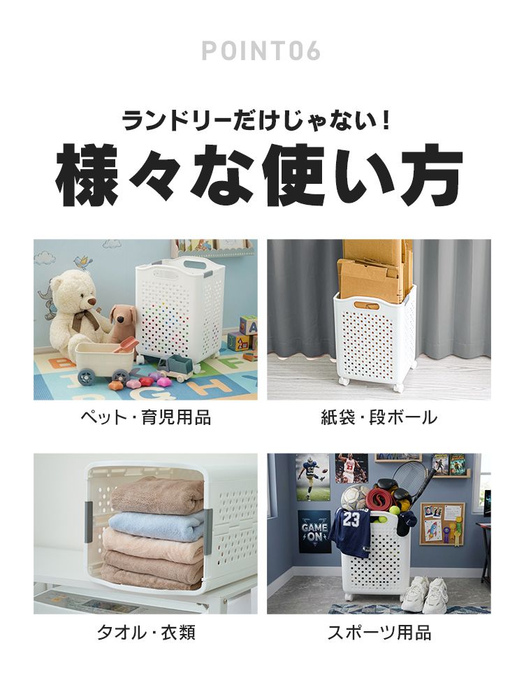 ランドリールームの洗濯物入れとしてはもちろん、おもちゃ収納やリビングの目隠し収納ボックスなど、多目的バスケットとしても活躍します。