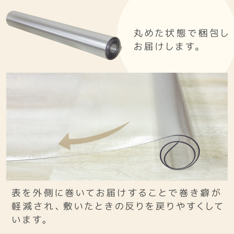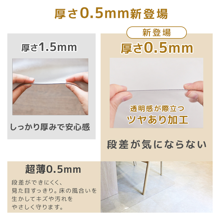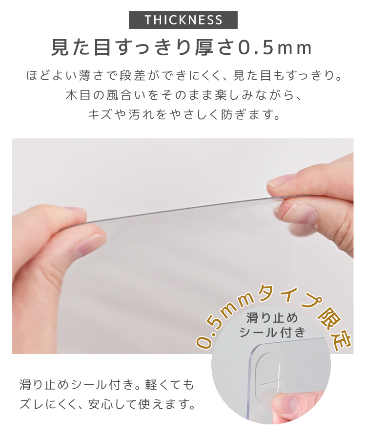 厚さ0.5mmのクリアタイプで、テーブルや椅子の色・デザインを邪魔せず、お部屋の雰囲気そのままに保護できます。
