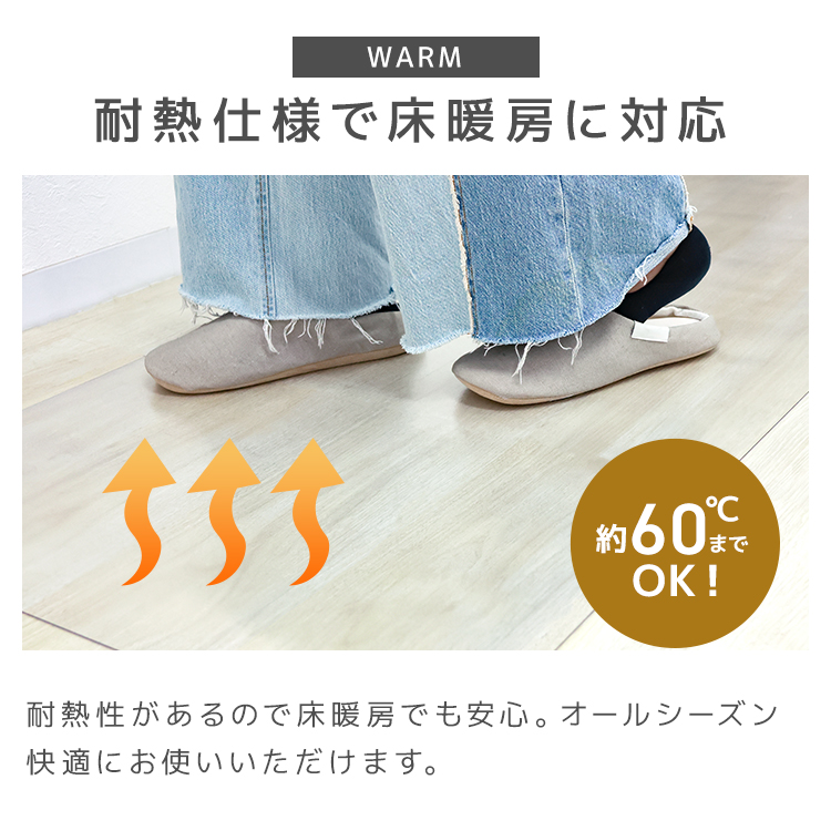 耐熱温度-30〜60℃の丈夫な素材で、床暖房対応・一年中快適に使用できます。