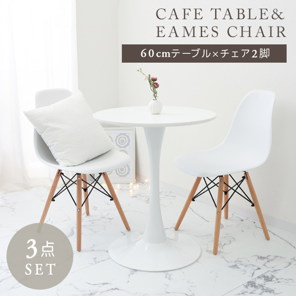 暮らしをよりおしゃれにするラウンド型テーブルとイームズチェア2脚のセットです。