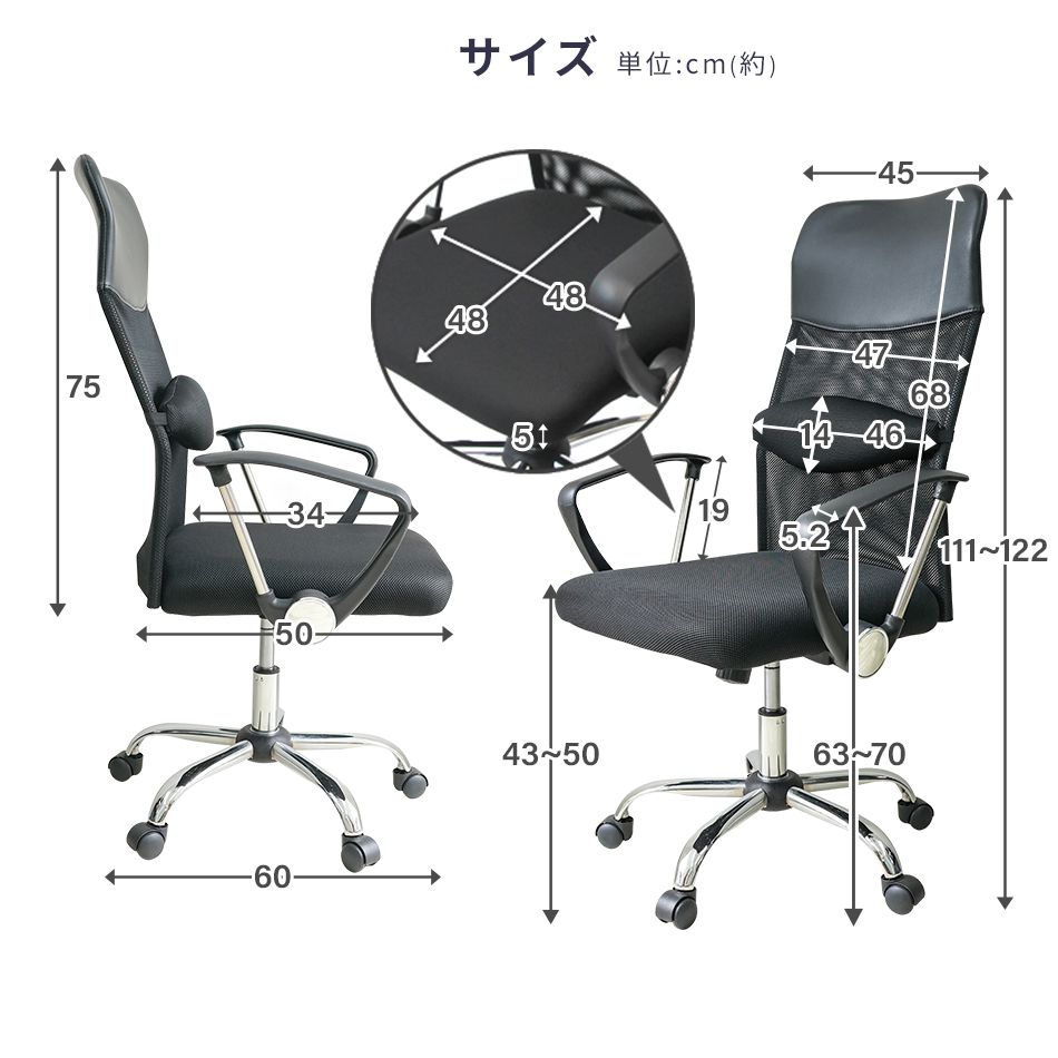 本体サイズ(約):幅63×奥行60×高さ111〜122cm(座面高43〜50cm)