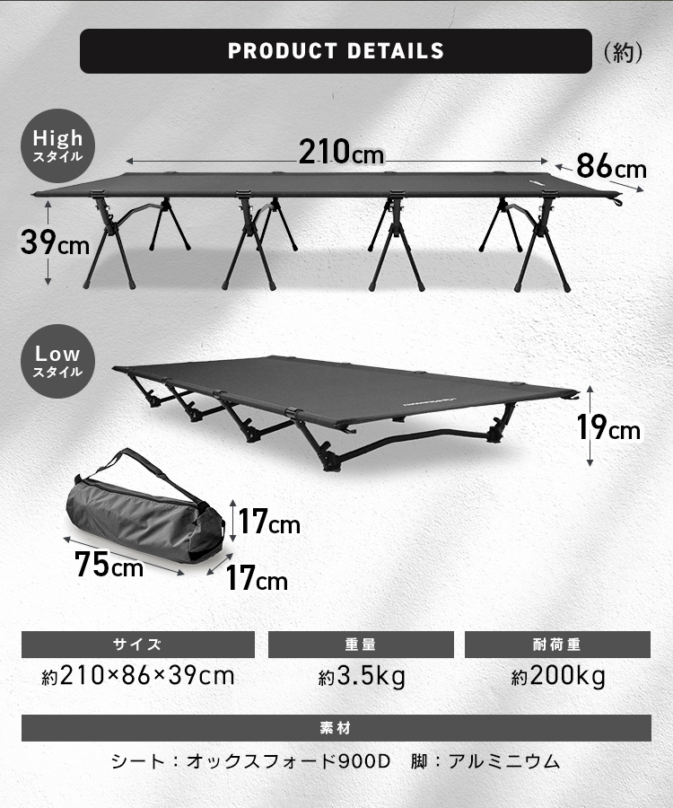 素材:オックスフォード900D(シート)、アルミニウム(脚)