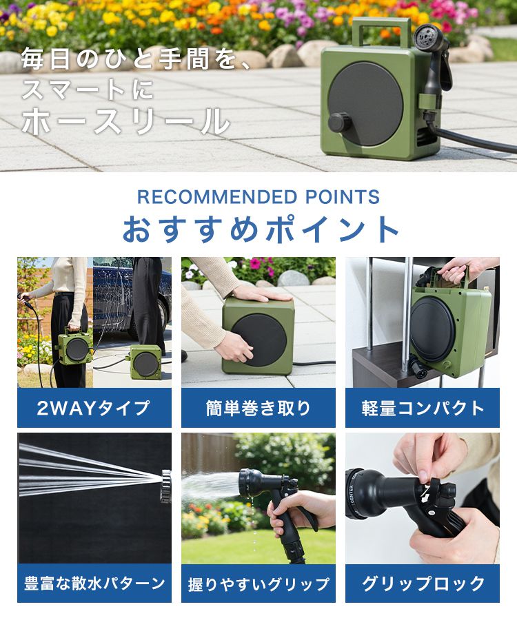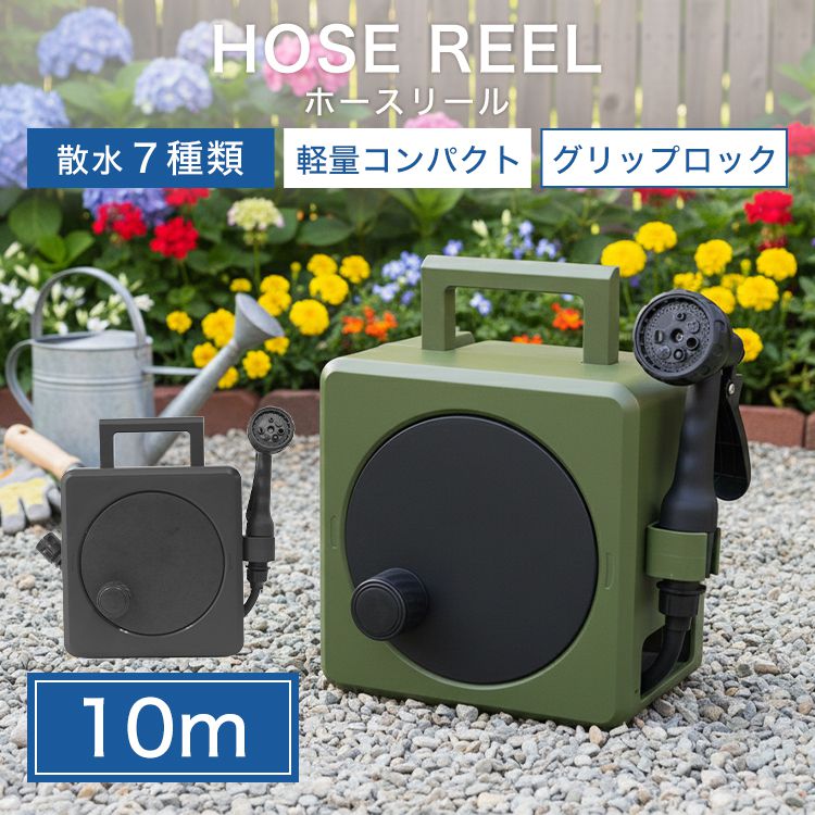 ホースリール 10m コンパクト 2WAY 手持ち 据え置き 散水ノズル付 軽量 おしゃれ ガーデニング 洗車