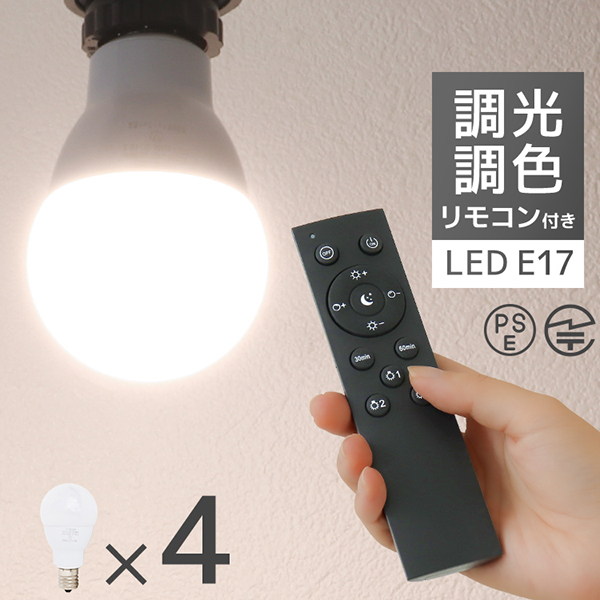LED電球 調光調色 専用リモコン付 電球4個 LED照明 口金E17 60W相当 広配光 調光器対応 工事不要 照明 おしゃれ 電球 LEDライト 昼光色 昼白色 電球色 一年保証
