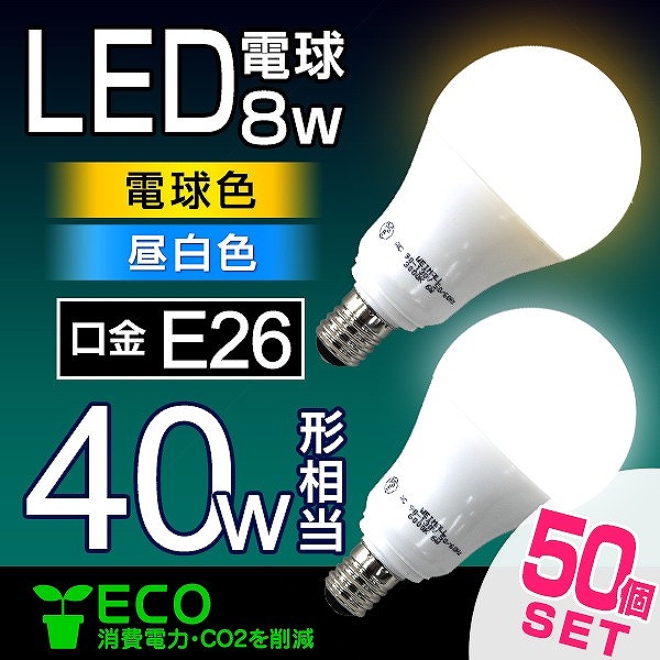 LED電球 8W 40W形 E26 一般電球 電球色 昼白色 ledランプ 省エネ 50個セット
