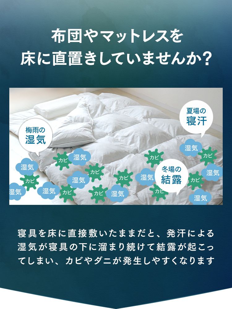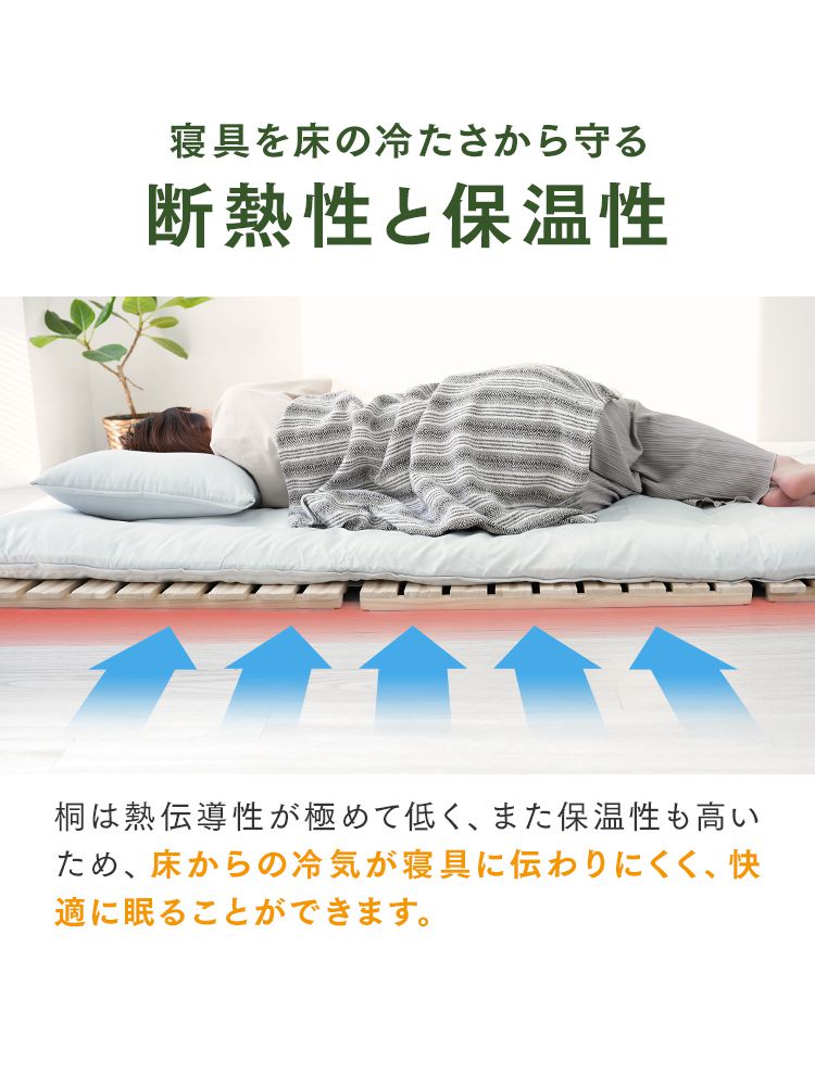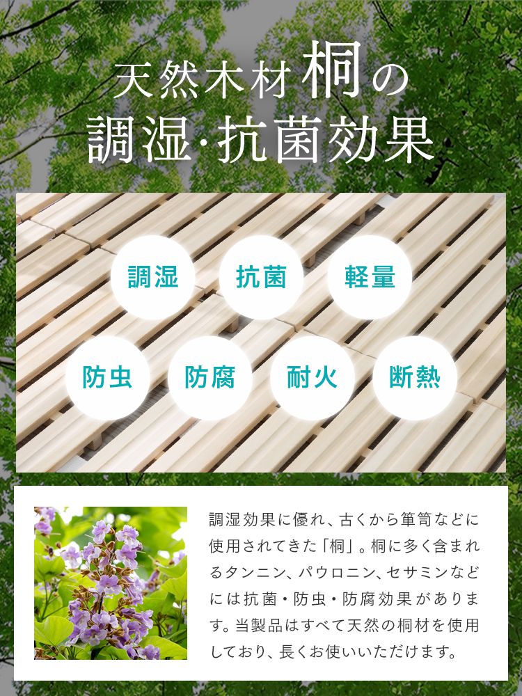 天然桐材の優れた通気性と軽さで、カビやダニの発生を防ぎ、毎日快適な睡眠環境をキープします。