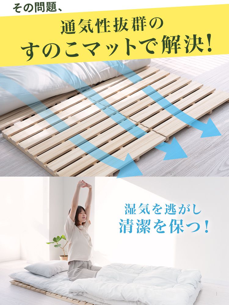 毎日の布団乾燥が簡単になる「三つ折りすのこマット」で、すっきり清潔な寝室に。