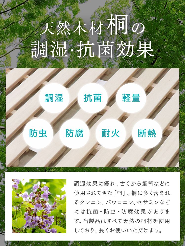 天然桐材の優れた通気性と軽さで、カビやダニの発生を防ぎ、毎日快適な睡眠環境をキープします。