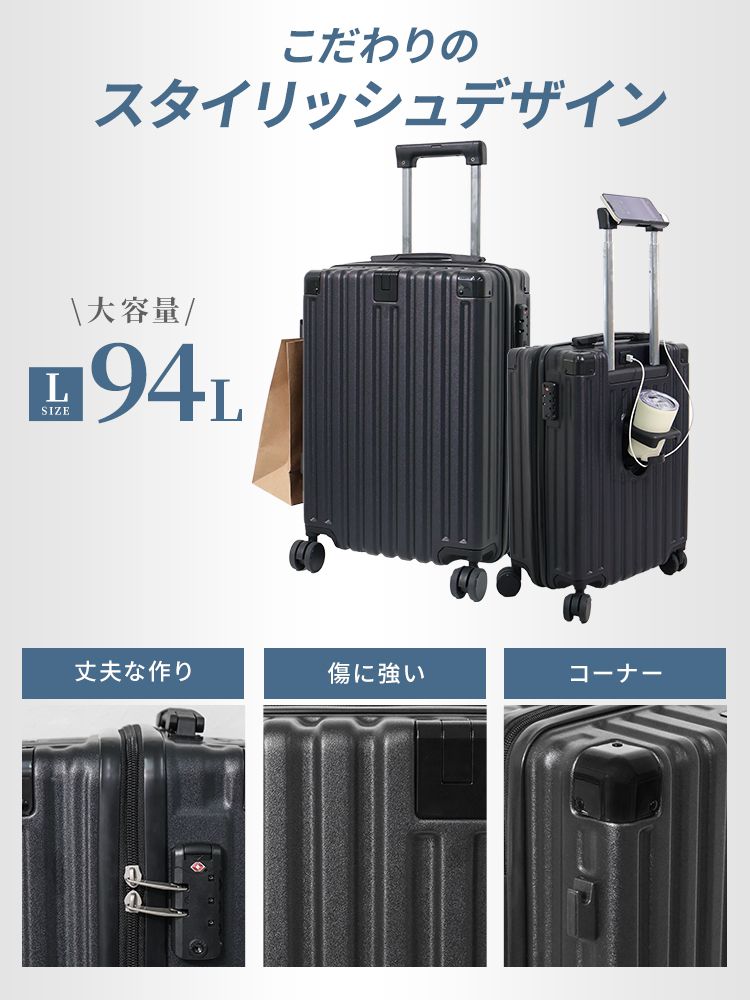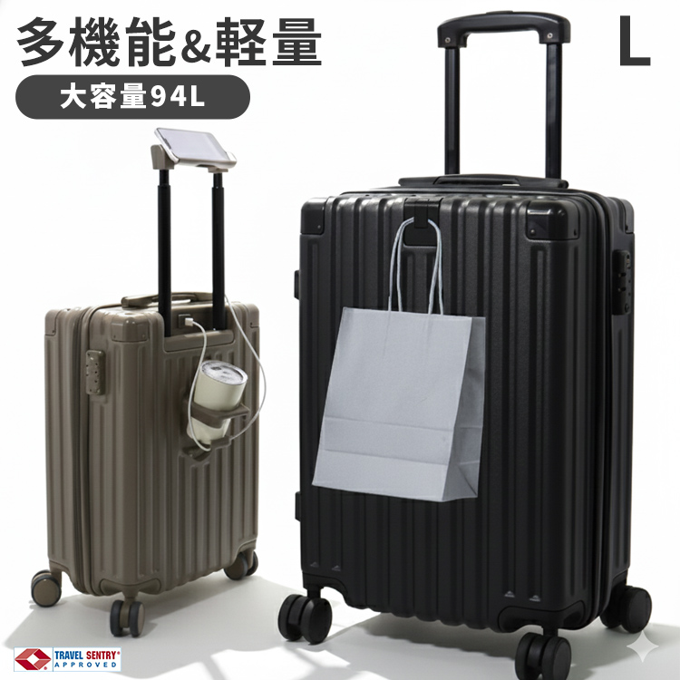 スーツケース Lサイズ 軽量 キャリーケース TSAロック USB充電ポート カップホルダー付き ハードタイプ 旅行 出張 静音 キャリーバッグ