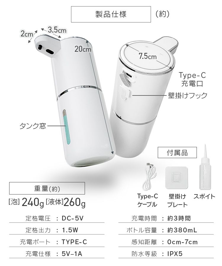 付属品:Type-Cケーブル、壁掛けプレート、スポイト