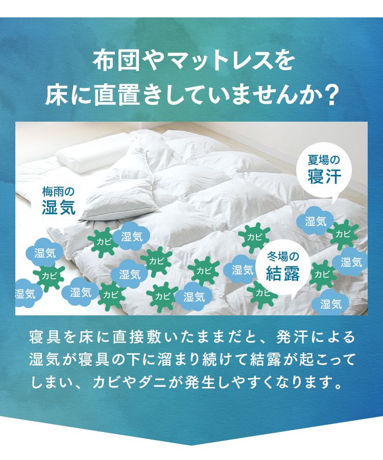 高さを設け、空気の通り道を作ることで湿気から布団を守ります。