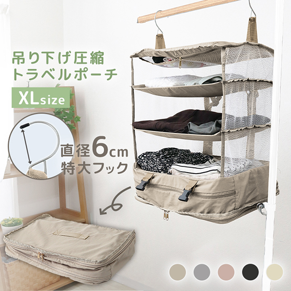 たっぷり収納でき、すっきり圧縮できる吊り下げトラベルポーチです。
