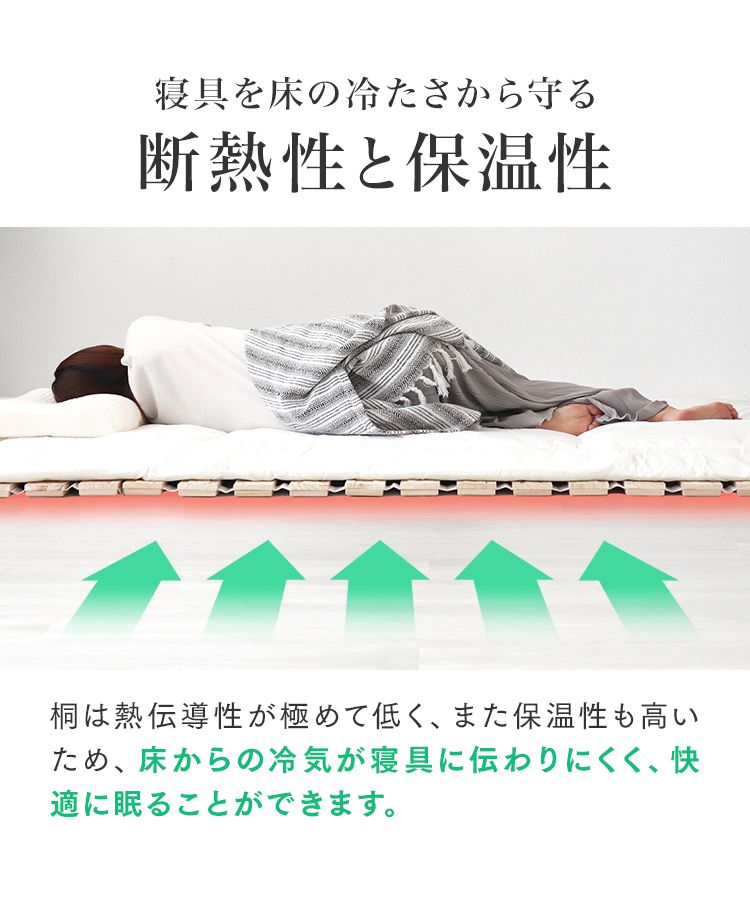 桐は、断熱性と保温性に優れ、寝具を床の冷たさから守ります。