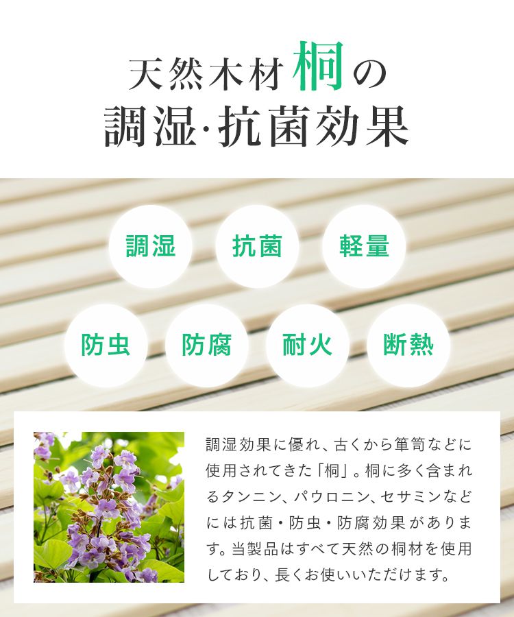 桐は、断熱性と保温性に優れ、寝具を床の冷たさから守ります。