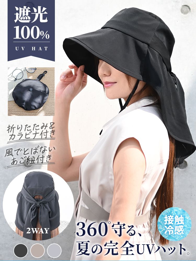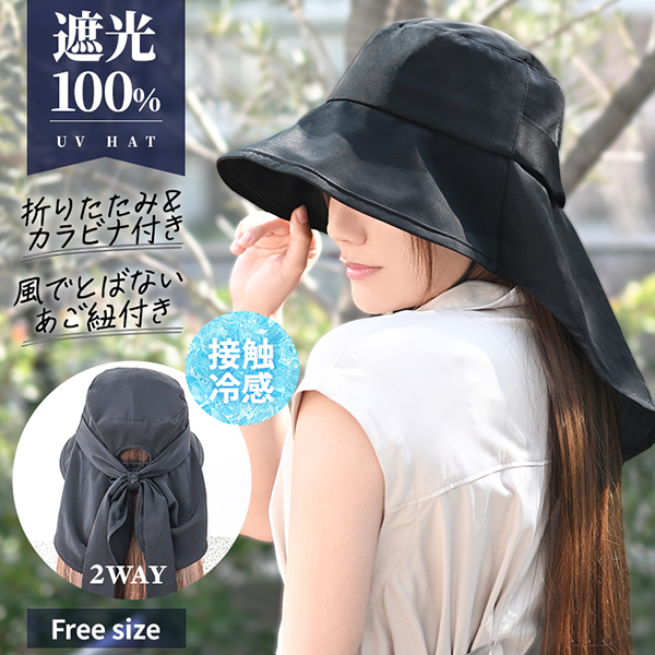 完全遮光 帽子 レディース 遮光100% 360度UVカット 折りたたみ 接触冷感 つば広 ハット あご紐・カラビナ付き 夏用 日よけ