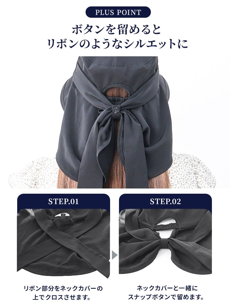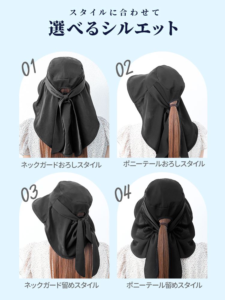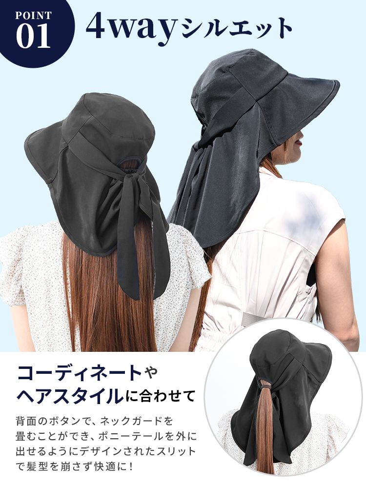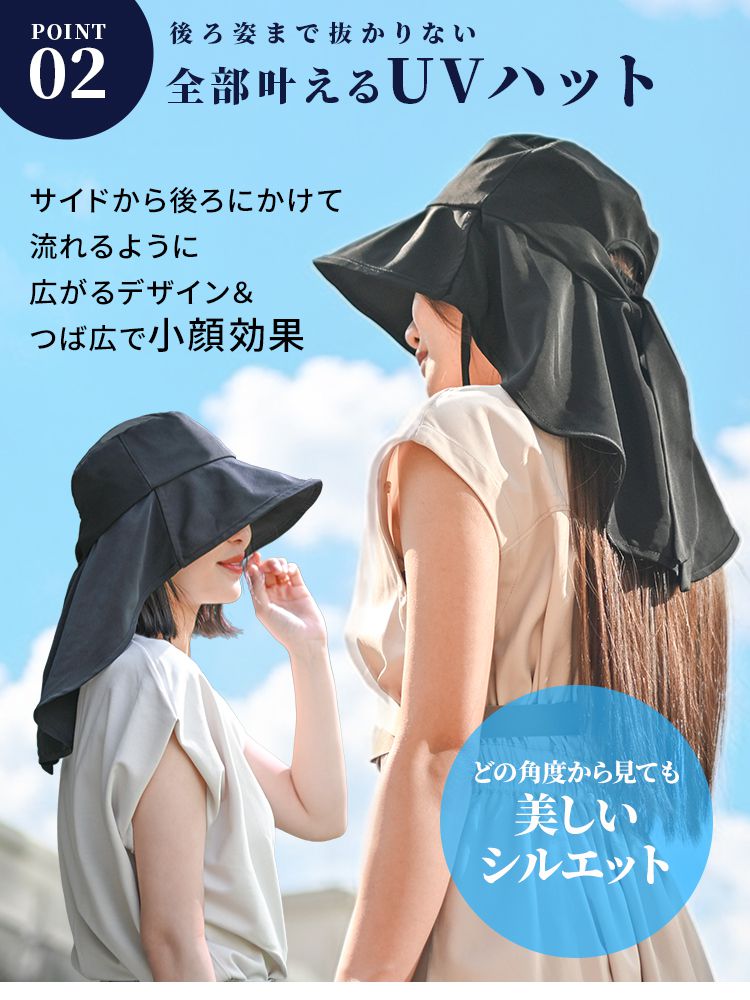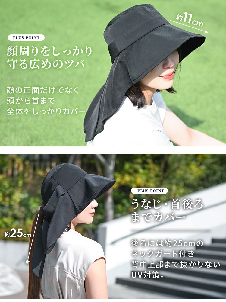 前後に広がるつばとロング後ろ布が、日焼けしやすい頬やうなじまで覆い、日中の外出や自転車移動も安心です。