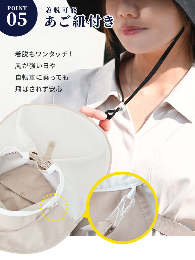 あご紐付きで風の強い日でも飛ばされにくく、取り外してすっきりシルエットでも使える2WAY仕様。