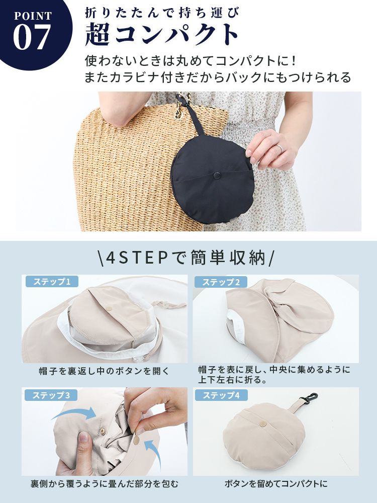 コンパクトに折りたためて付属カラビナでバッグに付けられるので、通勤・通学・旅行・アウトドア・ガーデニングなど、持ち歩きの日焼け対策アイテムとしても便利。