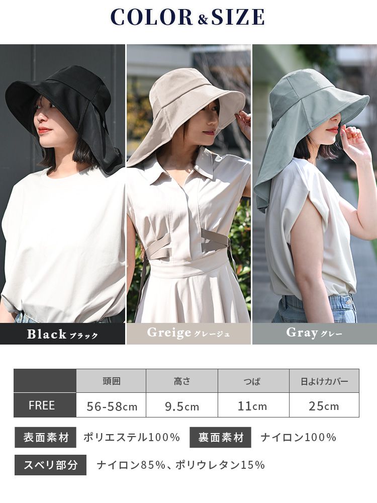 サイズ:フリー(頭囲56-58cm、高さ9.5cm、つば11cm、日よけカバー25cm)