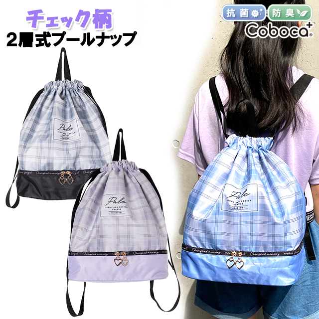 プールバッグ 女の子 子供 キッズ 2層式 プールナップ Coboca+ コボカ 抗菌 防臭 ポリ ロゴ チェック / ナップサック ボンザック 女子 小学生 【メール便】
