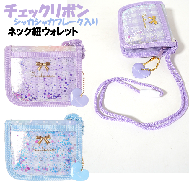 財布 子供 キッズ 女の子 リボン チェック シャカシャカ フレーク ネック紐 付き ウォレット 二つ折り財布 / 小学生 ジュニア ティーン 【メール便】