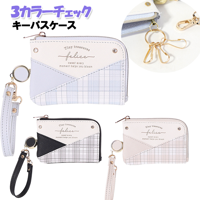 キーケース パスケース 女の子 学生 3カラー チェック 合皮 ロゴ リール付き ICカード入れ / 小学生 ティーン 定期入れ 通学 入学 【メール便】
