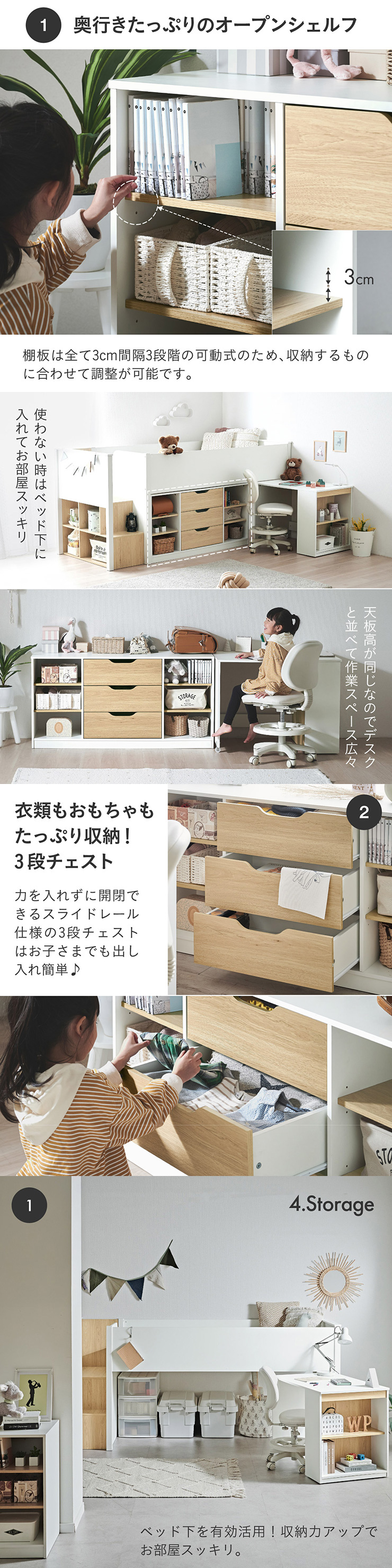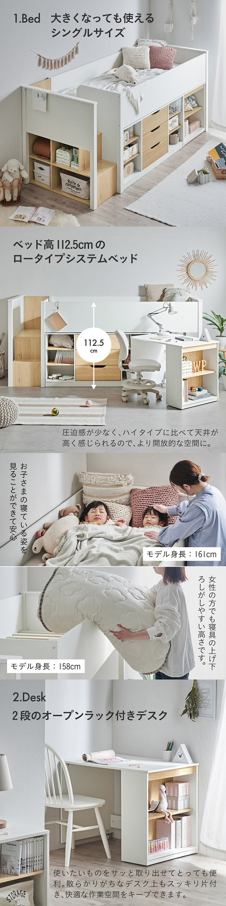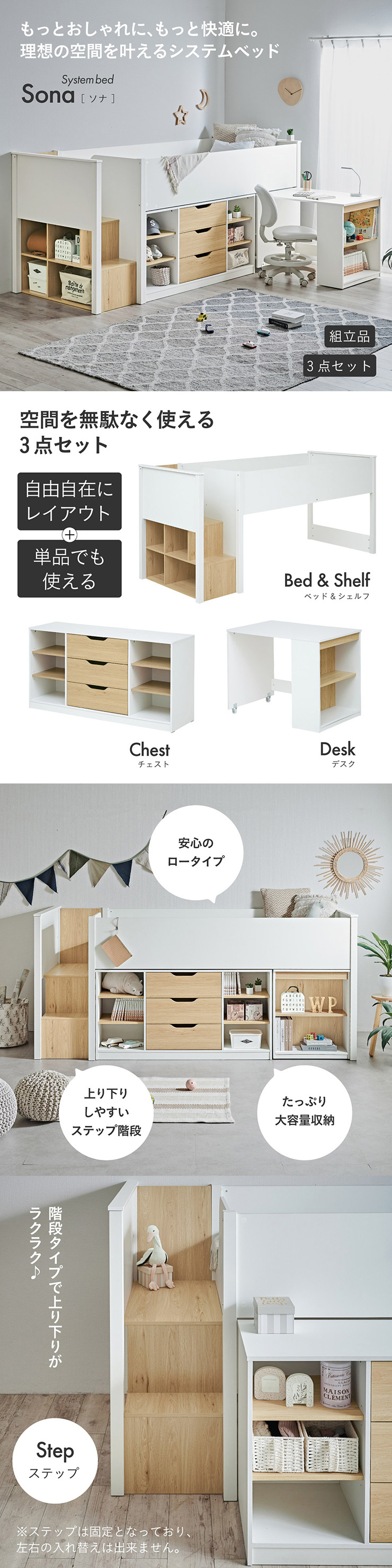 システムベッド 子供 大人用 ロータイプ 収納付き Sona(ソナ) ベッド下収納 3点セット チェスト付き デスク付き 階段タイプ キャスター付き おしゃれ