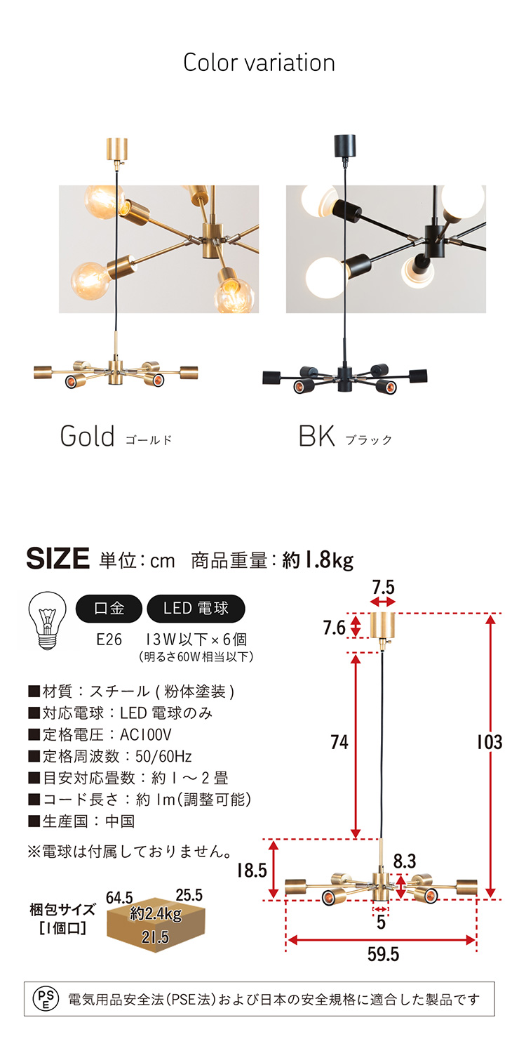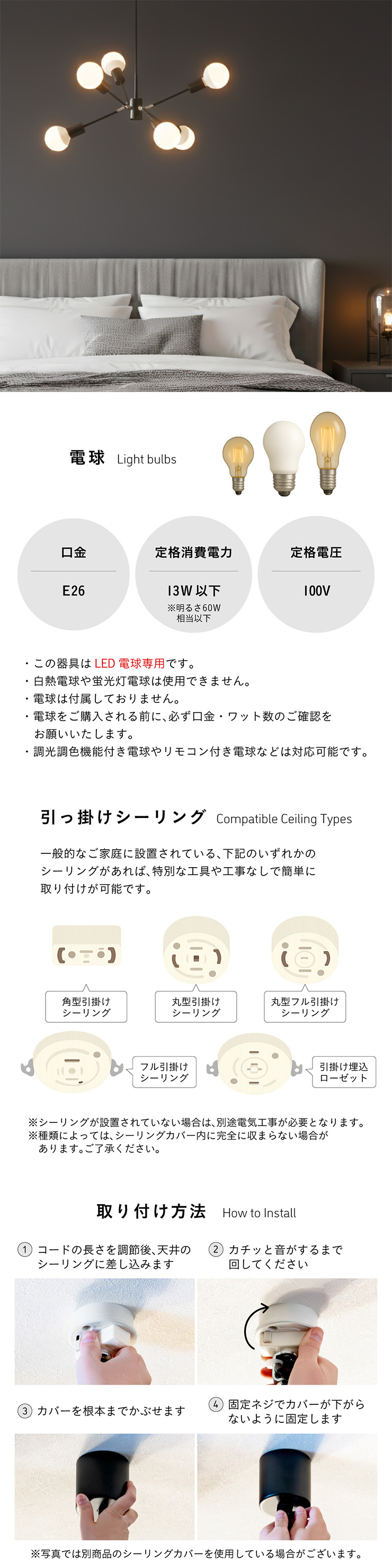 対応電球:LED電球のみ(E26/13W以下x6個)