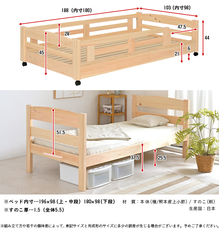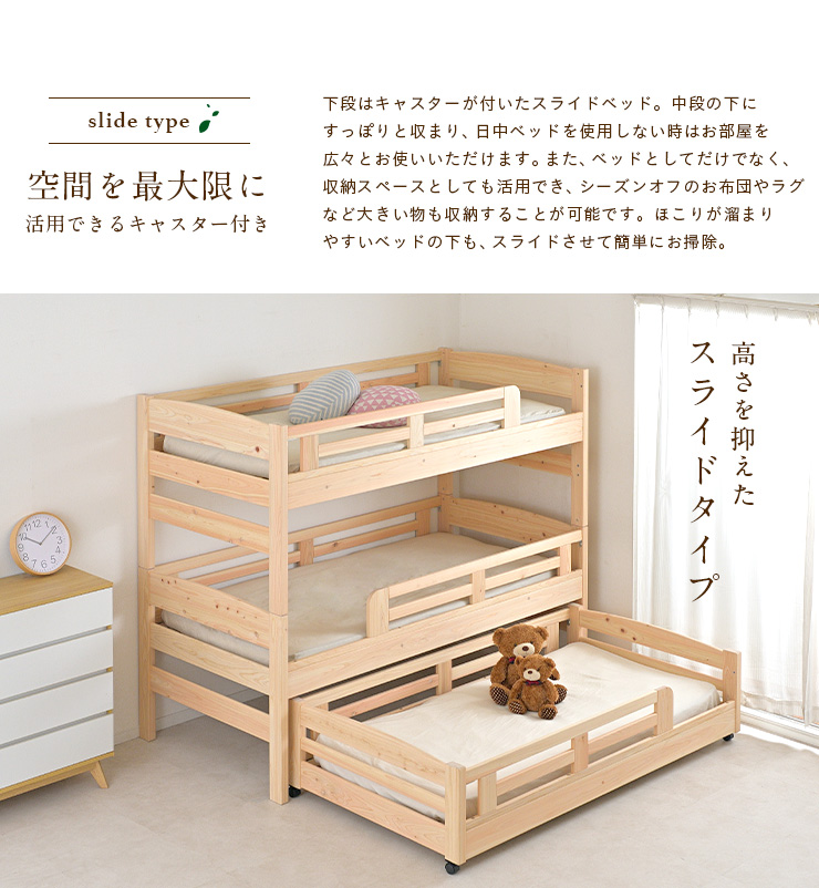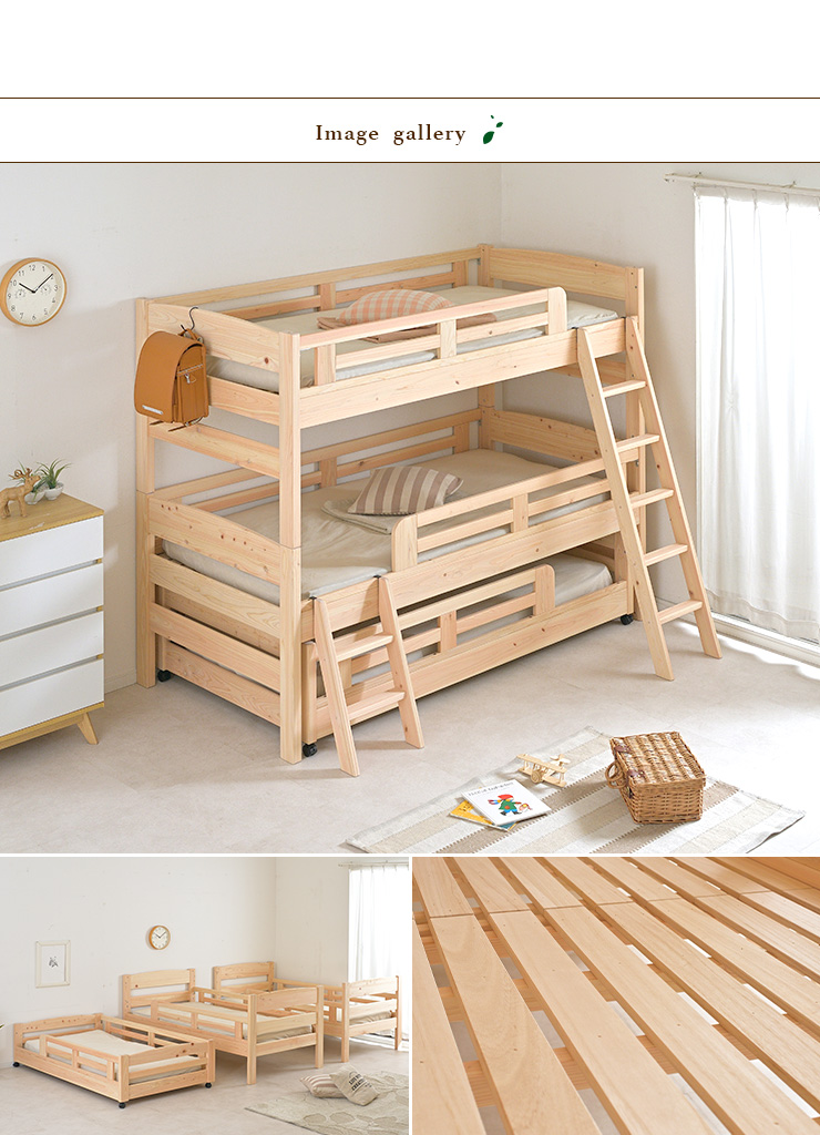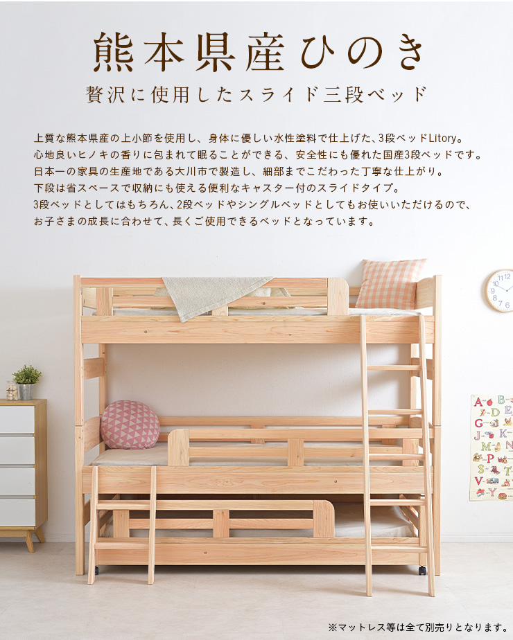 5年保証 国産 ひのき 三段ベッド 3段ベッド 親子ベッド 親子三段ベッド 親子3段ベッド 二段ベッド シングルベッド 檜 日本製 キャスター付き Litory2(リトリー2)