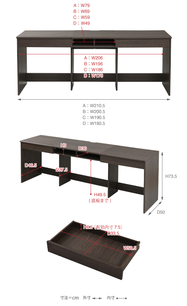 W180.5/190.5/200.5/210.5 x D50 x H73.5cm