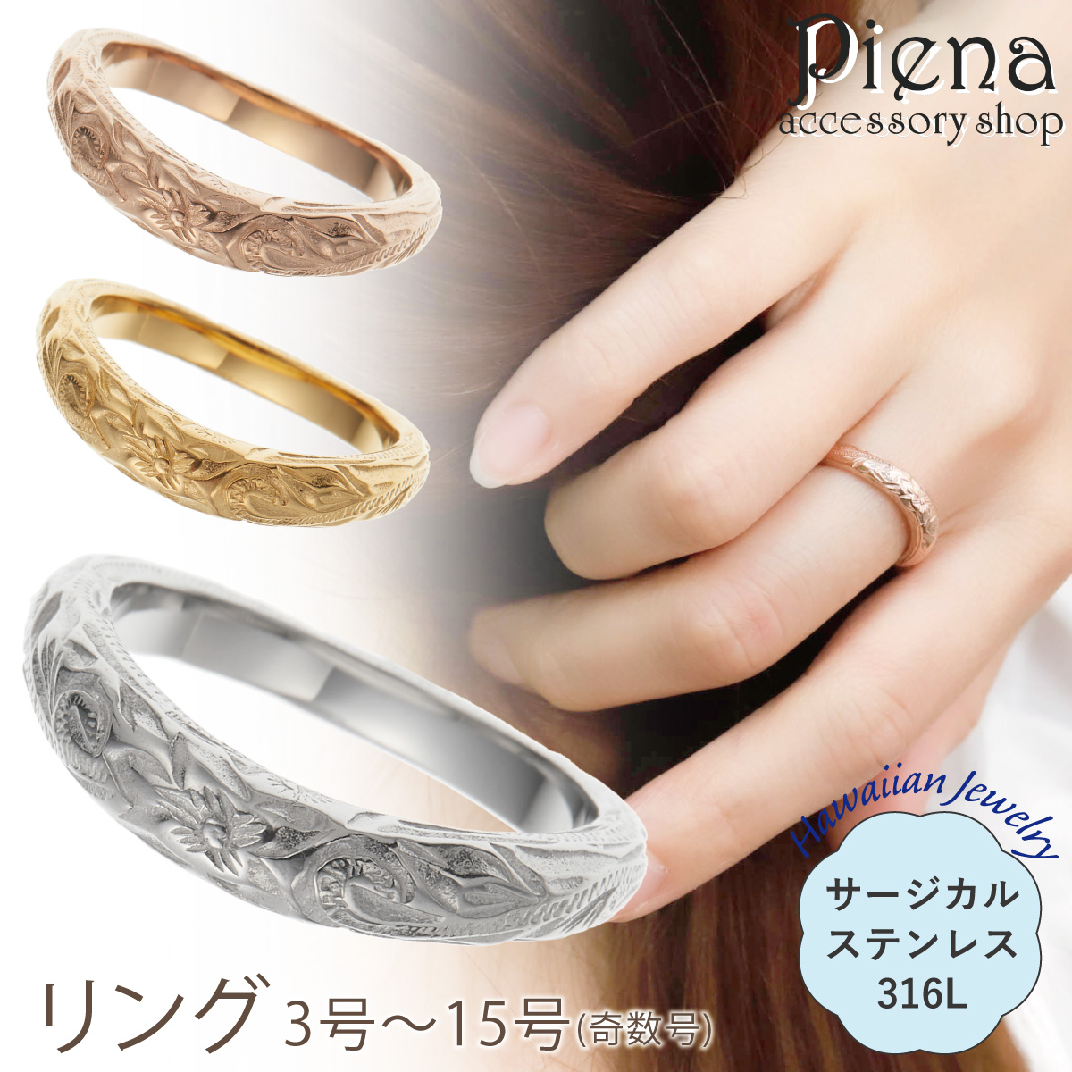 リング レディース サージカルステンレス316L ウェーブ V字 甲丸 細身 華奢 ハワイアンジュエリー ハワジュ プルメリア 花 スクロール 波 ピンキーリング 小指 お肌に優しい 金属アレルギー対応 金アレ 上品 シンプル 誕生日 記念日 プレゼント ギフト
