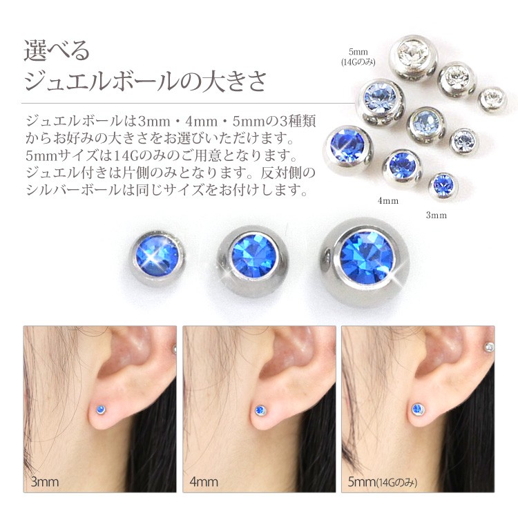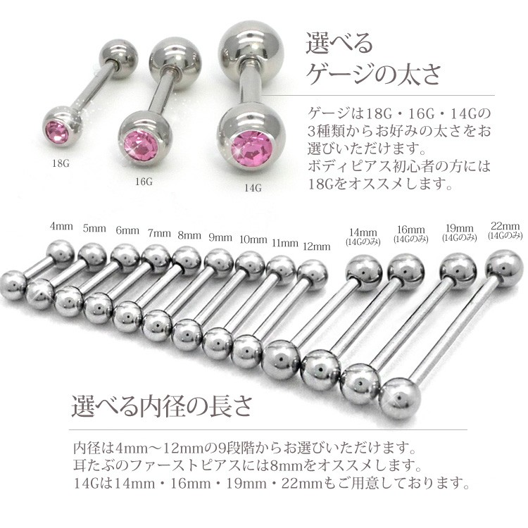 太さは18G・16G・14Gの3サイズでご用意。軸の長さも豊富です。ジュエルボールは、定番のクリアの他にもポップなピンクやブルーなど、
