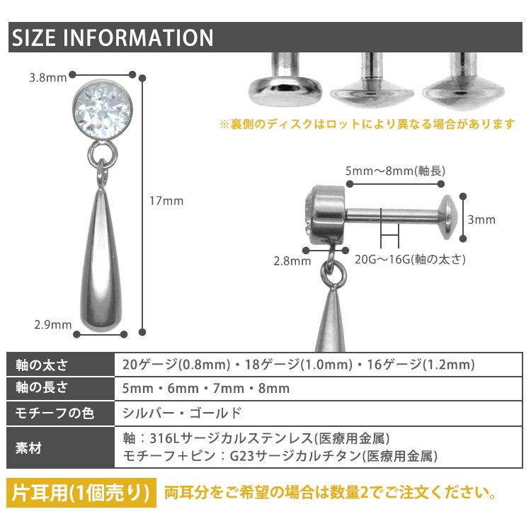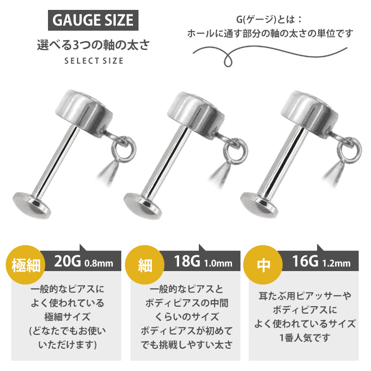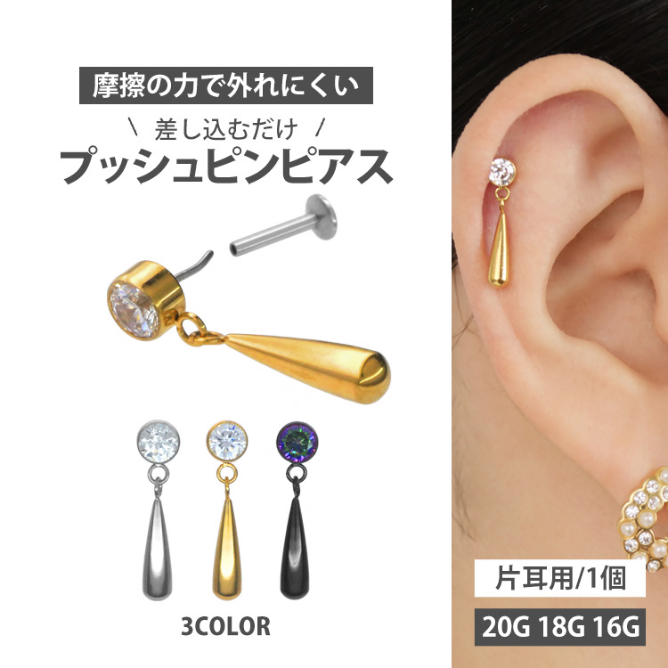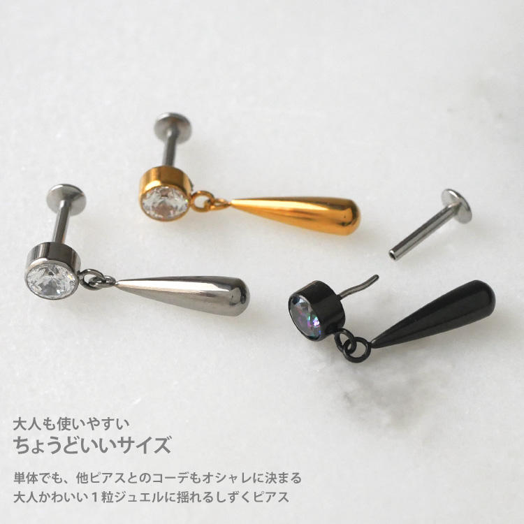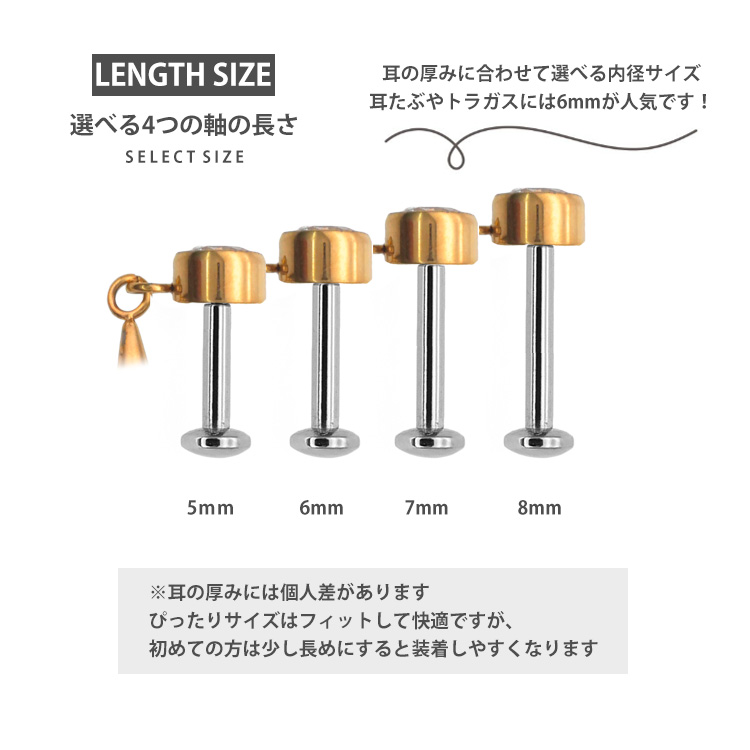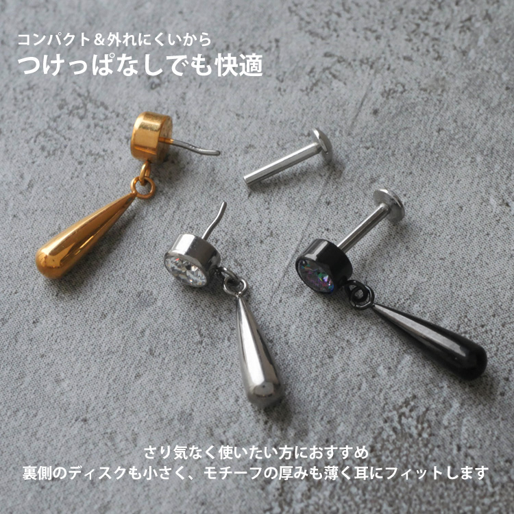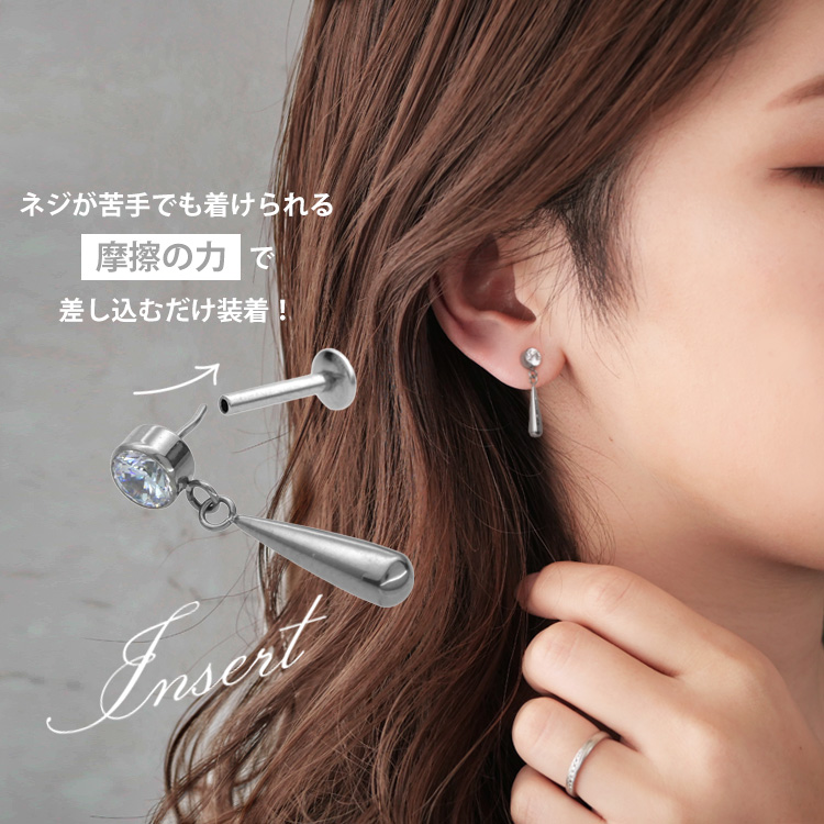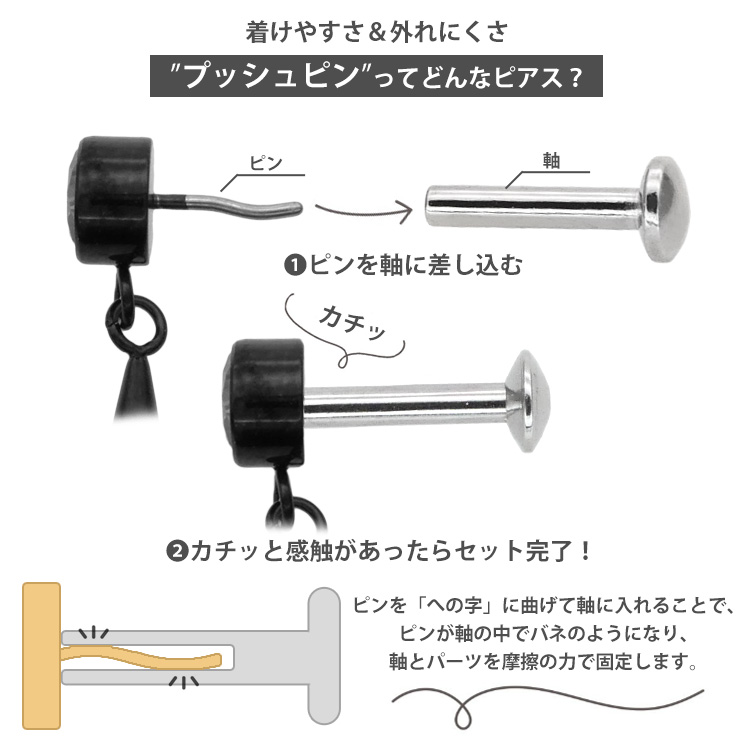 ・自分ではネジが留めにくいトラガスやヘリックスなどの軟骨部位でも、ピンを軸に差し込むだけで簡単に装着が完了します。