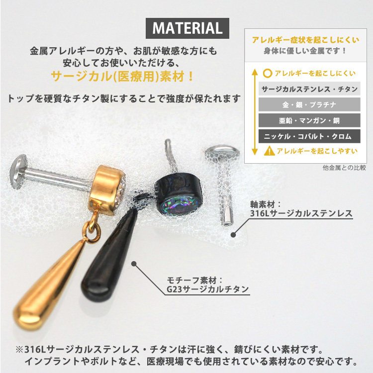 🛡 Point 03|肌に優しい高品質素材。サージカルステンレス&チタン・軸(ポスト)には医療器具にも使われる