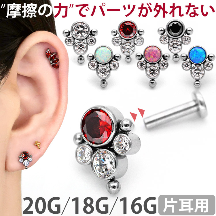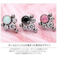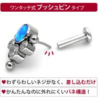 ボディピアスの定番アイテム、ラブレットスタッドがワンプッシュタイプの斬新設計に。 ありそうでなかった、ネジ不使用のボディピアスが登場。トラガスのような狭い部位や、ネジタイプが苦手な方には特にお勧めです。大きめのカラージュエル、オパールを囲むように3粒のボールと大小3つのジュエルが1つになった、お目立ち度抜群の大ぶりアイテム。ヘッド部分から伸びるピンを軸に差し込めば装着完了です。ネジが無いので、知らない間に緩んできて失くしてしまった、そんな悩みからも開放されます。