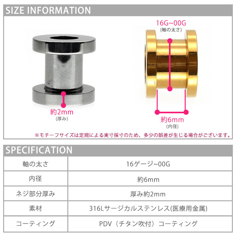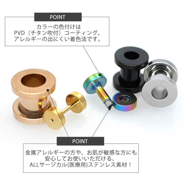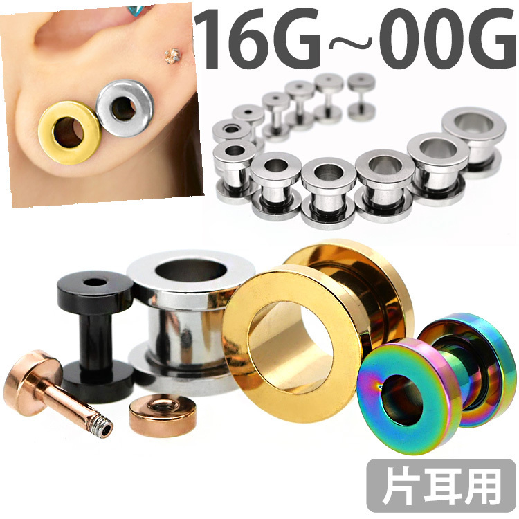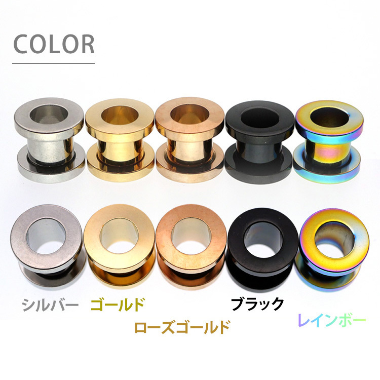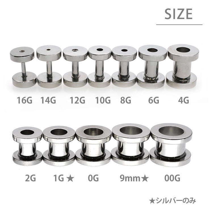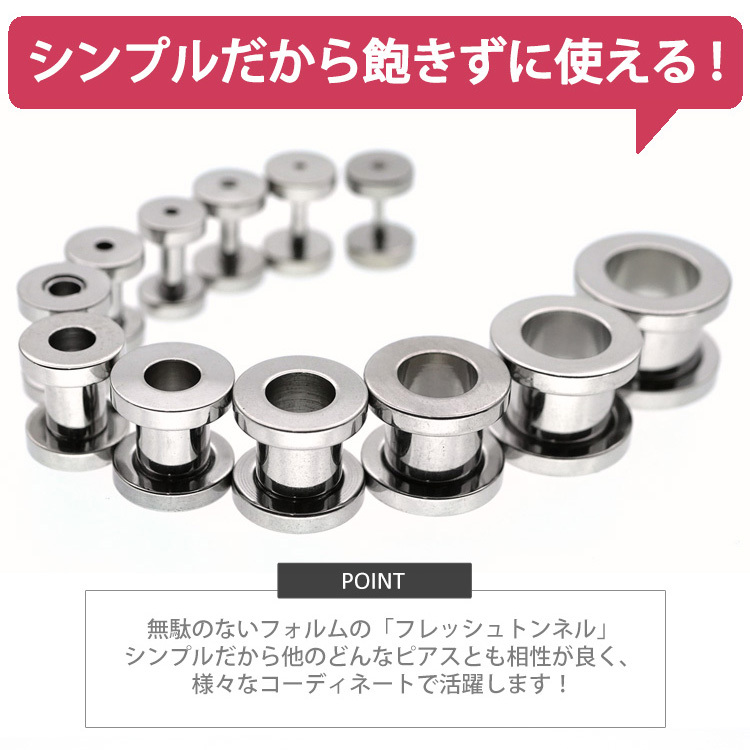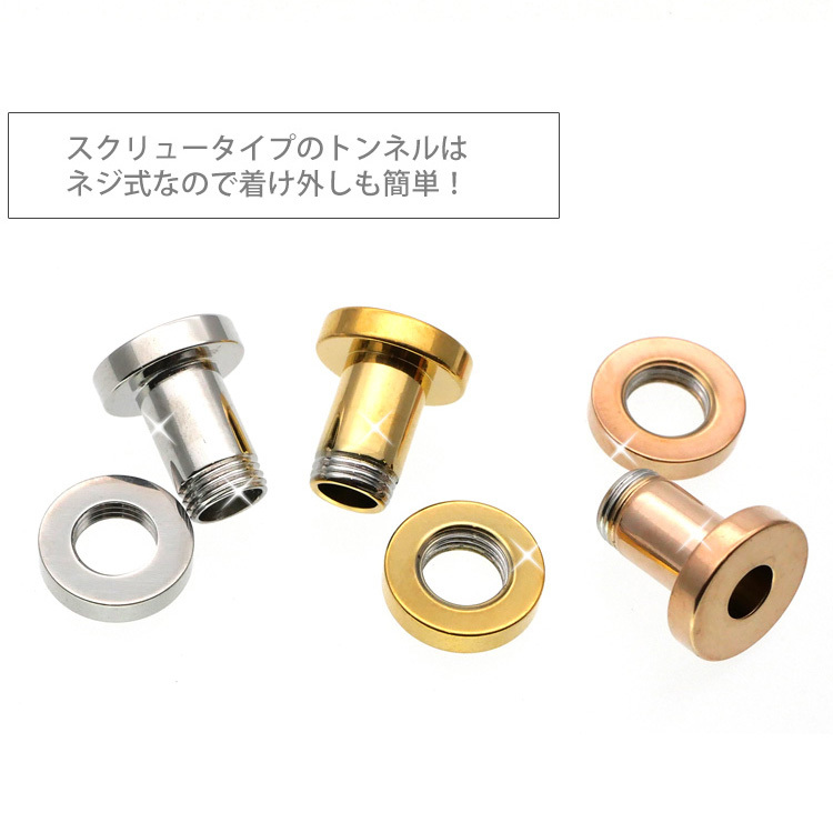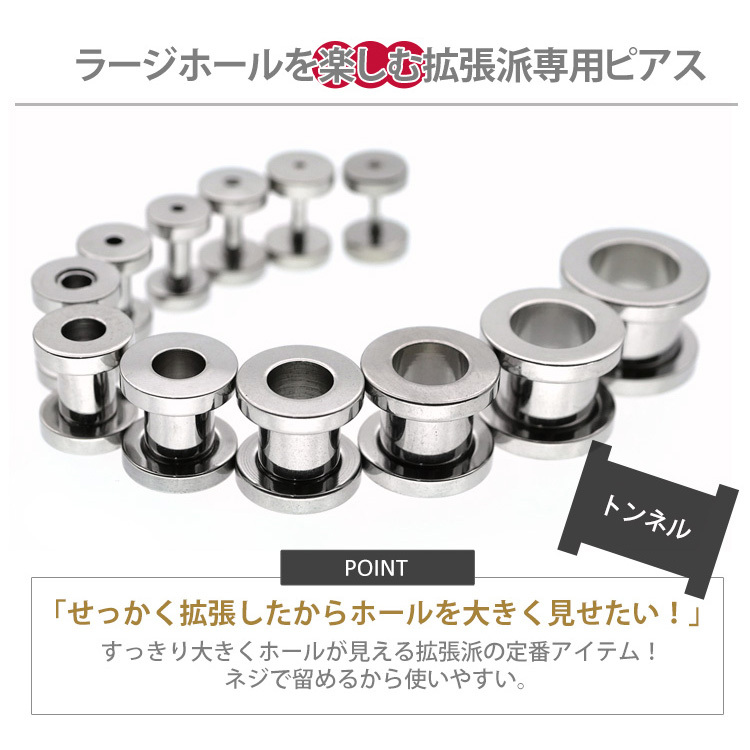 大きなホール向けのボディピアスの定番商品です。トンネルの名前のとおり耳の裏側の風景がみえるのが特徴です。サイズを拡張するほど向こう側がはっきりとみえる大きな穴となります。片側がネジ式のキャッチになっているので、取り付けもカンタンです。太さのサイズも16G、14G、12G、10G、8G、6G、4G、2G、1G、0G、00Gと豊富なので、一段階ずつの拡張にも最適です。ピアスの材質は金属アレルギーの方でも安心なサージカルステンレスを使用しております。
