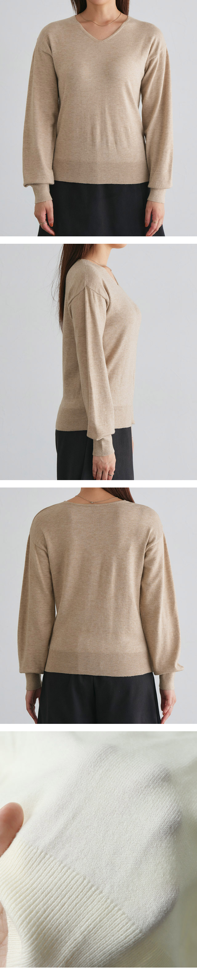 カシミヤのようなふんわり柔らかな肌触りが嬉しいニット素材。程良く薄手の素材なので長い時期着回せます。静電気防止加工を施しているので、インナーとしても着やすい一枚。ご自宅でお洗濯が可能なところも魅力の一つです。