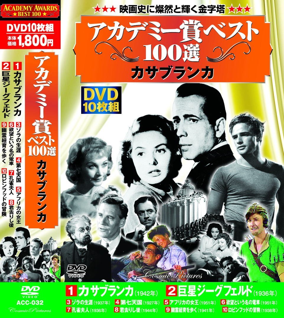 | <仕様> 10DVD ■品番:ACC-032 ■JAN:4959321952191 ■発売日: 収録時間 :1212分 リージョンコード: リージョン2 販売元: 株式会社 コスミック出版 <収録内容> 1. カサブランカ ( 102分 モノクロ 1942年 ) 監督 : マイケル・カーティス 出演 : イングリッド・バーグマン、ハンフリー・ボガート 男たちの真の優しさと、二人の男の間で揺れ動く 女の純愛を描いたハードボイルド・ラブストーリー。 挿入歌の「時の過ぎ行くままに」は永遠の名曲。 2. 巨星ジーグフェルド ( 176分 モノクロ 1936年 ) 監督 : ロバート・Z・レオナード 出演 : ウィリアム・パウエル、ルイーゼ・ライナー ブロードウェーの興行主にして天才、 フローレンツ・ジークフェルドの半生を描いた伝記映画。 螺旋階段の舞台で踊られるダンスをワンショットで見せるカメラワークは秀逸。 3. ゾラの生涯 ( 116分 モノクロ 1937年 ) 監督 : ウィリアム・ディターレ 出演 : ポール・ムニ、ジョセフ・シルドクラウト パリの屋根裏部屋で画家のセザンヌと同居していた小説家のゾラ。 やがて大作家の道を歩んでいく彼の半生を描いた伝記映画。 主演は「科学者の道」のポール・ムニ。 4. 第七天国 ( 118分 モノクロ 1927年 ) 監督 : フランク・ボーゼージ 出演 : ジャネット・ゲイナー、チャールズ・ファレル 下水道掃除の職から道路清掃へ転職することが主人公チコの人生の目標だった。 第七天国と呼んでいた自宅で不幸な娘を保護するが、やがて彼は戦地に召集される…。 5. アフリカの女王 ( 104分 カラー 1951年 ) 監督 : ジョン・ヒューストン 出演 : ハンフリー・ボガート、キャサリン・ヘプバーン 独軍に侵攻された東アフリカ。 蒸気船「アフリカの女王」号で厳しい自然やドイツの軍艦などの 困難を切り抜けていく船長と彼に助けられた女性ローズの傑作アドベンチャー。 6. 欲望という名の電車 ( 125分 モノクロ 1951年 ) 監督 : エリア・カザン 出演 : ヴィヴィアン・リー、マーロン・ブランド 気位の高いブランチはすべてを失いニューオリンズの妹のアパートへ転がり込む。 衰えていく美貌と消せない過去の狭間で彼女は「発狂」へと向かい…。 7. 孔雀夫人 ( 101分 モノクロ 1936年 ) 監督 : ウィリアム・ワイラー 出演 : ウォルター・ヒューストン、ルース・チャタートン サムは第二の人生を妻と謳歌すべく長年憧れていたヨーロッパへと旅立つ。 客船の中で妻の愚かな振る舞いを黙認していたが、彼はある夫人と出会い…。 8. 君去りし後 ( 170分 モノクロ 1944年 ) 監督 : ジョン・クロムウェル 出演 : クローデット・コルベール、ジェニファー・ジョーンズ 大戦に夫を送り出した夫人は、娘たちと留守宅を守っていたが、 男手を補うために退役した大佐を下宿させることにした…。 第二次世界大戦下の「若草物語」風な作品。 9. 幽霊紐育を歩く ( 94分 モノクロ 1941年 ) 監督 : アレクサンダー・ホール 出演 : ロバート・モンゴメリー、クロード・レインズ 飛行機事故で死んだが、天国へ向かう中継所で 予定よりも50年も早い死だったことを知ったボクサーのジョー。 彼には変わりの肉体が与えられ地上に戻れることになるが…。 10. ロビンフッドの冒険 ( 102分 カラー 1938年 ) 監督 : マイケル・カーティス、ウィリアム・キーリー 出演 : エロール・フリン、オリヴィア・デ・ハヴィランド 兄王の遠征での不在を狙い圧政を敷く弟王。 貴族のロビンは仲間をシャーウッドの森に集め、 平和な世界を取り戻すために冒険と戦いの旅に出る。 超一級のアドベンチャー作品。 ※ 作品はすべて日本語字幕入りです。 ※ クラシック作品のため、一部画像の乱れ、ノイズがあります。ご了承ください。