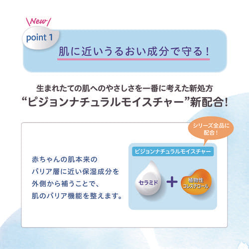 未熟な赤ちゃんの肌に不足しがちな、お肌本来のうるおい類似成分「ピジョンナチュラルモイスチャー※」配合した全身泡ソープです。