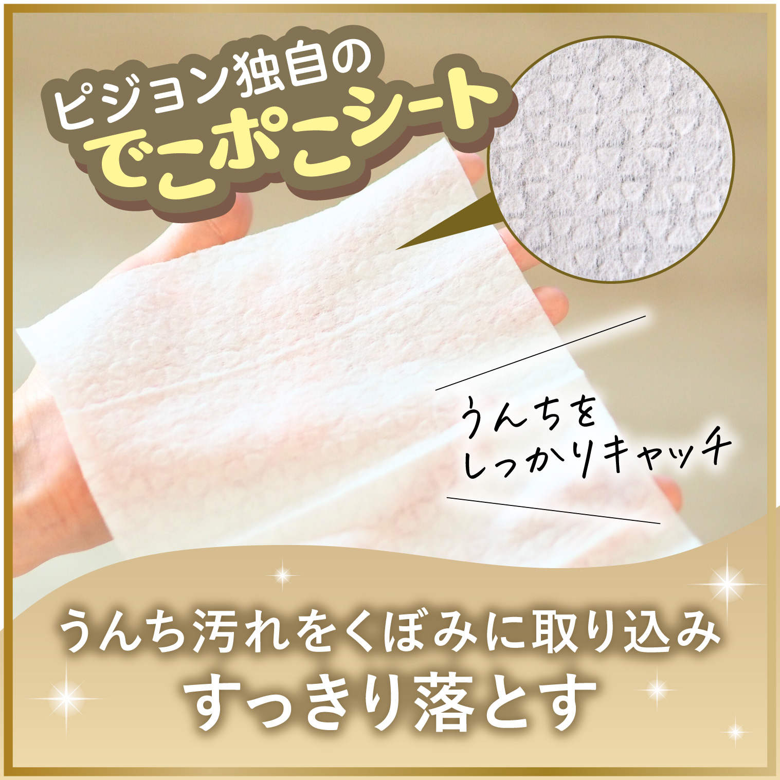 ・ピジョン独自のでこポこシートでやさしいチカラでもうんち汚れをくぼみに取り込みすっきり落とす。
