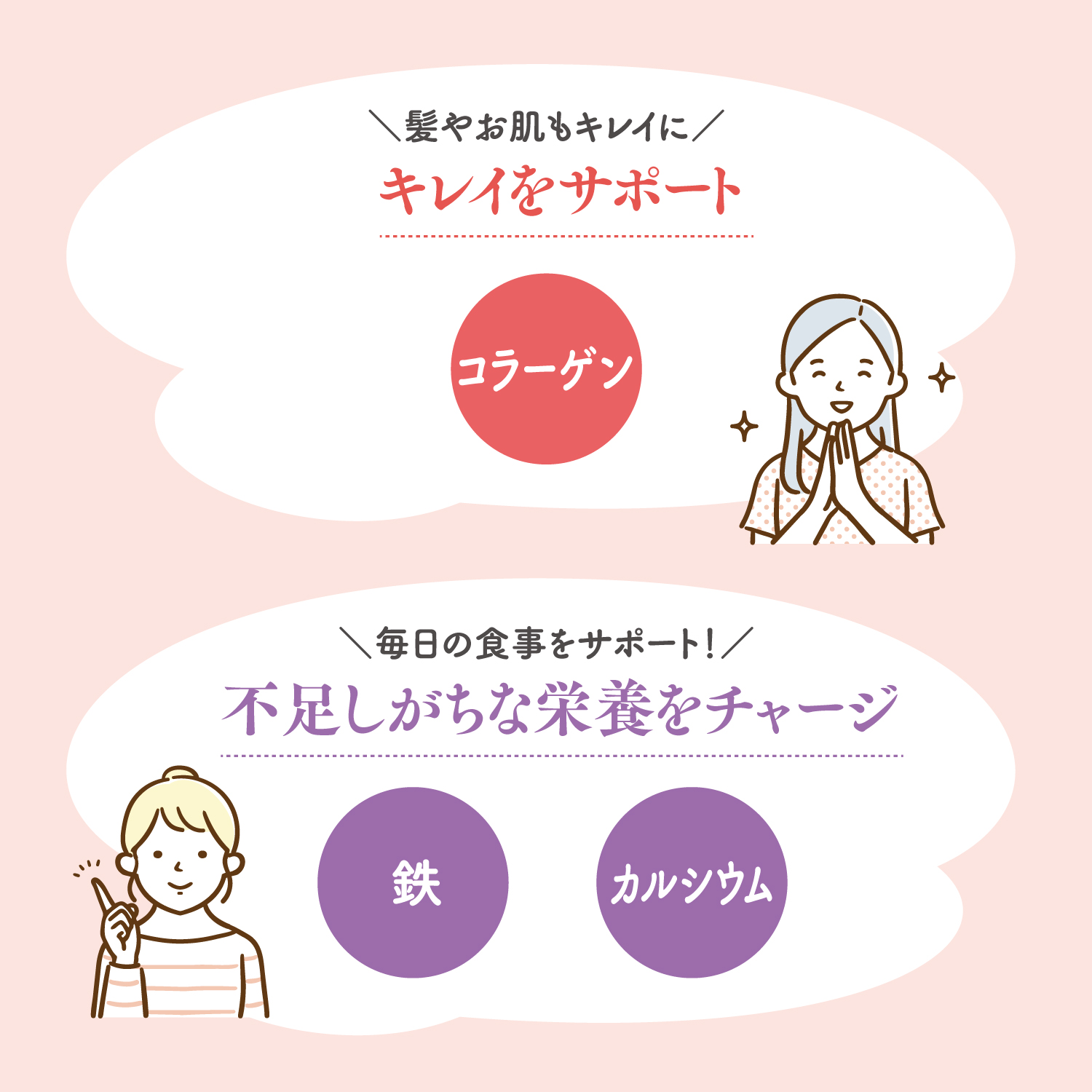 9種のビタミン、鉄、GABA、テアニン、Ca、コラーゲン、亜鉛