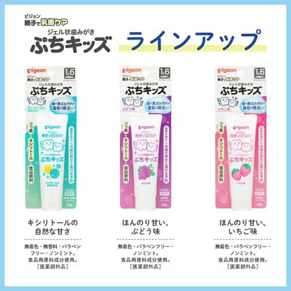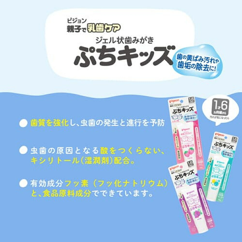 ●「歯磨き剤」の「ジェル状歯みがき ぷちキッズ」は、歯の再石灰化を促進し歯質を強化する、有効成分フッ素(フッ化ナトリウム)配合しており、虫歯の発生と進行を予防します。