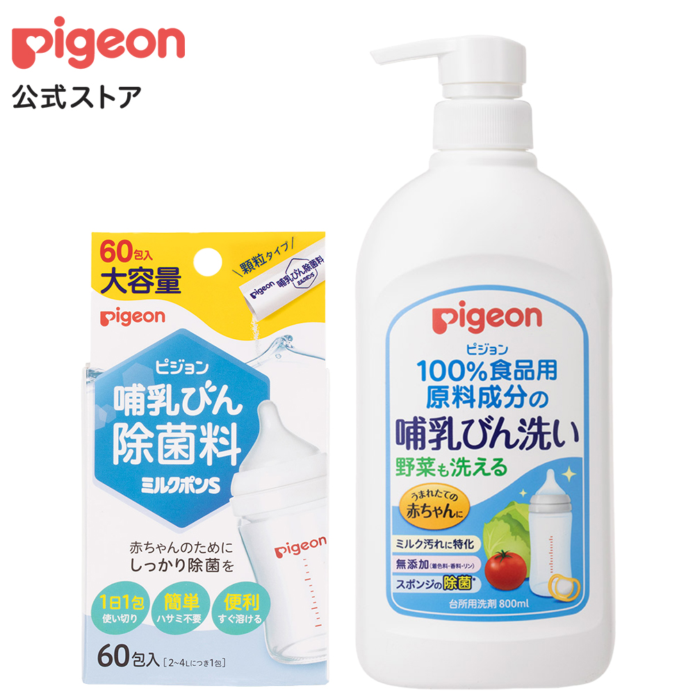 哺乳の洗浄・消毒ができる哺乳びん洗い+哺乳びん除菌料ミルクポンS60包のセットです。