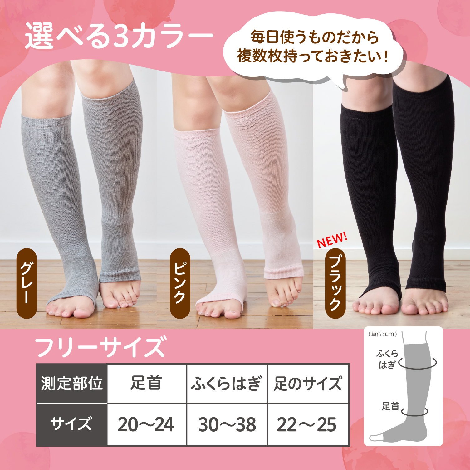 ふくらはぎを下からググッと持ち上げる独自の編地で締め付けがツライ妊娠期〜産後も、ほどよく引き締め脚スッキリ