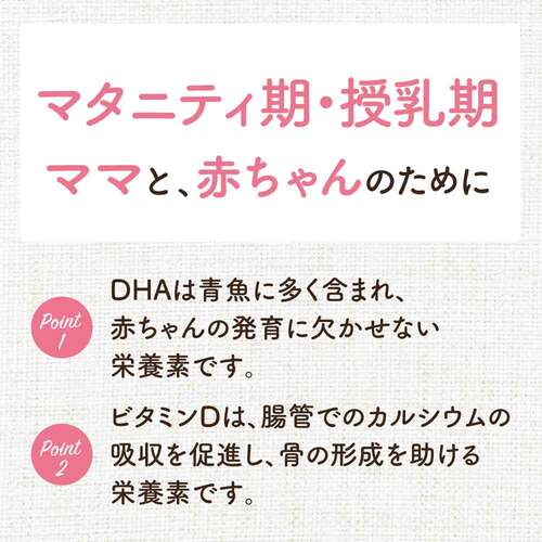 ●毎回の食事で摂取するのが難しい、青魚に多く含まれるDHA(350mg)に加え、カルシウムの吸収を促進して骨の形成を助けるビタミンDも配合。