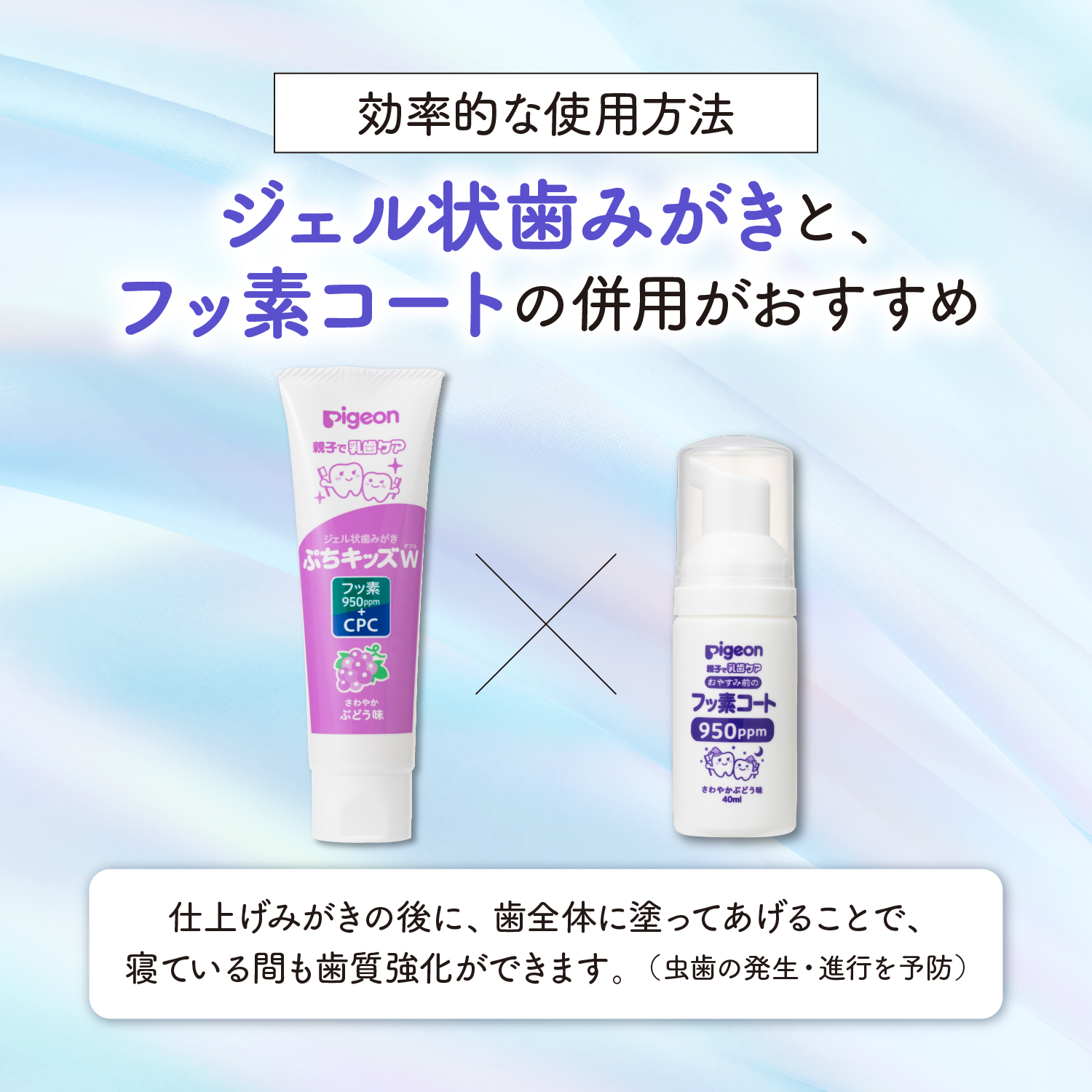 ・むし歯を防ぐ有効成分「高濃度フッ素950ppm+CPC」ダブル配合。