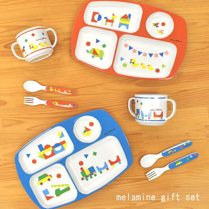 ●メラミン食器のギフトセットです。ランチプレートと両手付きマグ、スプーン、フォークの4点がセットになっています。