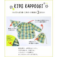 ●110〜120cmサイズの子供用かっぽうぎ。おそろいの三角巾と巾着袋が付いた3点セットです。