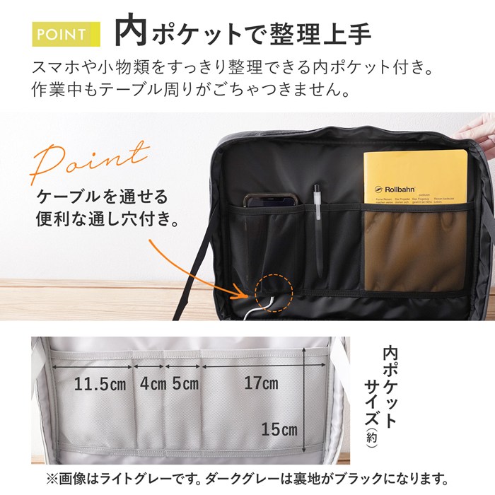 内ポケットで整理上手スマホや小物類をすっきり整理できる内ポケット付き。作業中もテーブル周りがごちゃつきません。スマホのケーブルを通せる便利な通し穴付き。